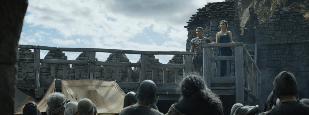 Arondir stands beside Bronwyn at Ostirith as the remaining villagers prepare for an attack. Unfortunately, the Southlands really suffer from the decision to include all 4 plotlines in Partings. The lack of characterization for Arondir, Bronwyn, and Theo continues to show and makes their decisions difficult to understand. I understand that a fort like Ostirith under siege may evoke The Lord of the Rings: The Two Towers at the battle of Helm’s Deep; the characters in the Southlands do not. When faced with certain death, it is difficult to get behind why these characters are choosing to remain here. It only seems logical that the creators want a big battle for Season 1 for The Rings of Power.